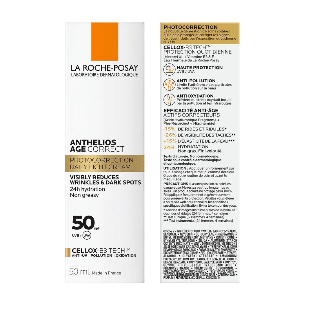 La Roche-Posay Anthelios Age Correct SPF50 is a daily anti-aging sunscreen that provides high sun protection while correcting signs of aging such as wrinkles, fine lines, and dark spots. Enriched with dermatological actives, it helps restore skin firmness and radiance while shielding from UVA, UVB, and infrared damage.